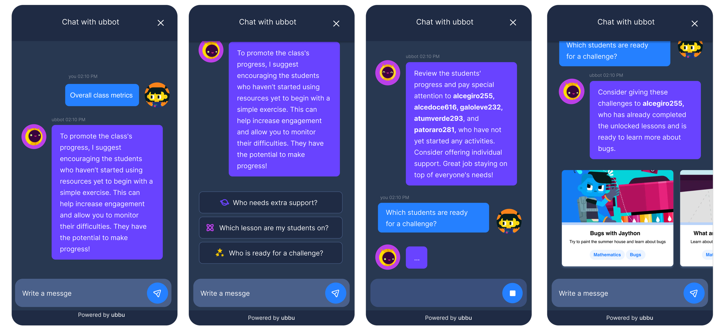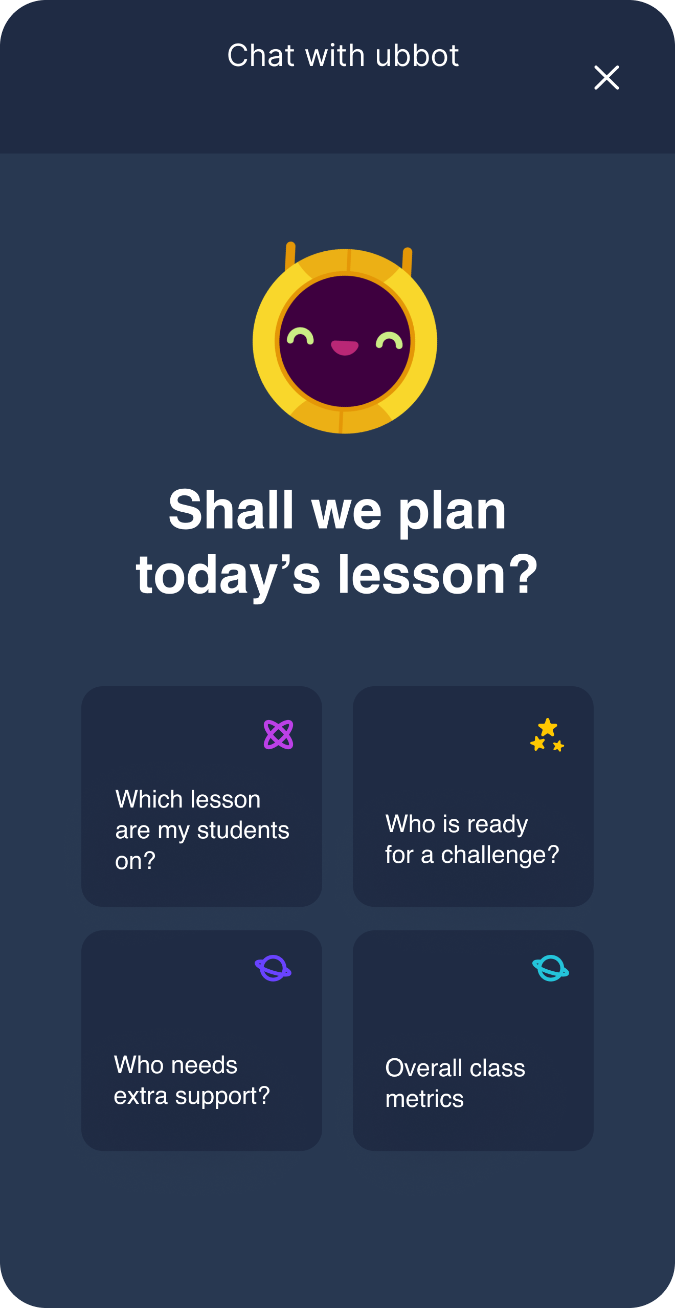 For teachers, it closes the loop that ubbot opens. Soon, individual results will be visible in the dashboard: giving them a fast, reliable way to see who's ready to move forward and who might need a different kind of support.