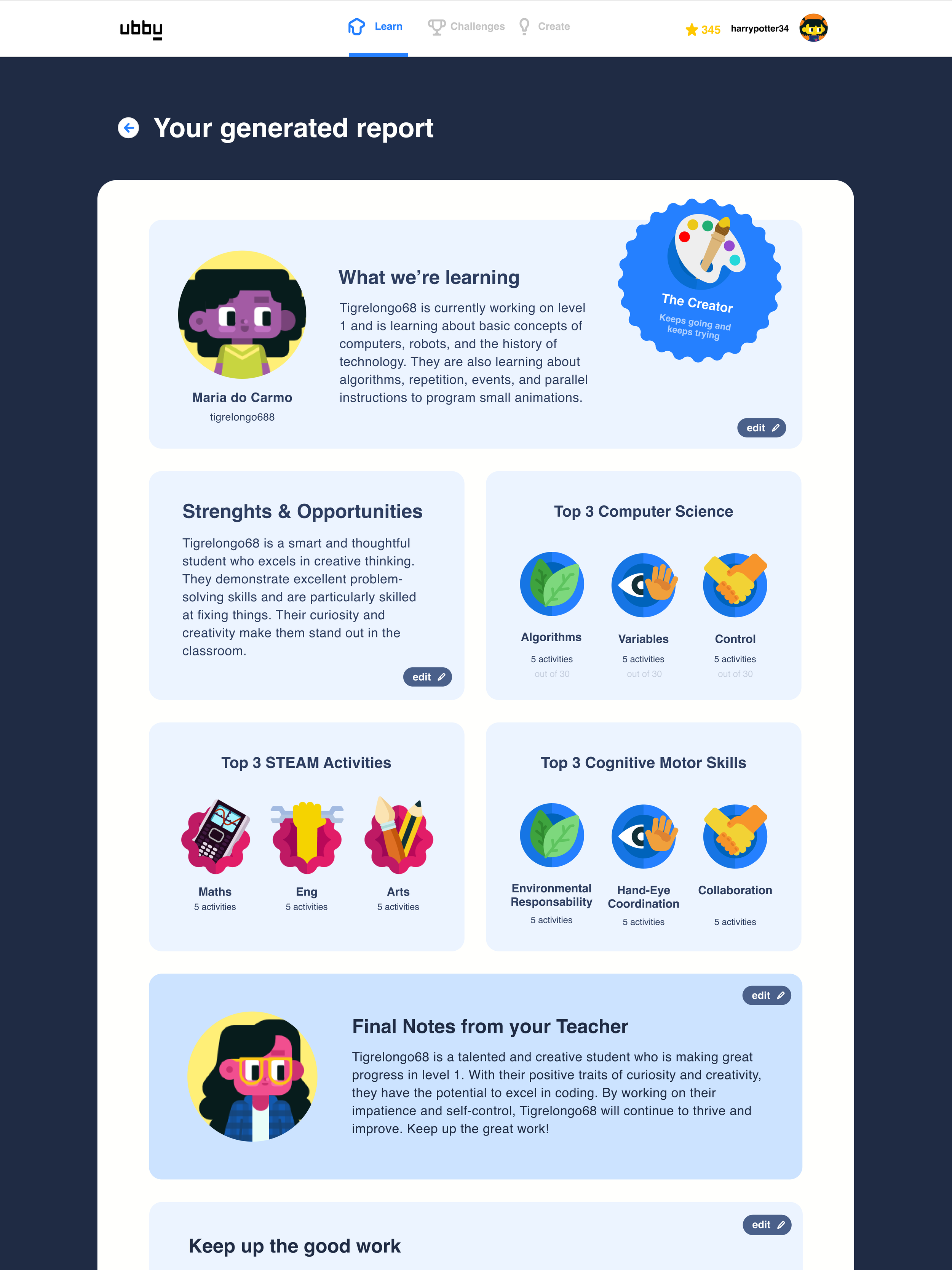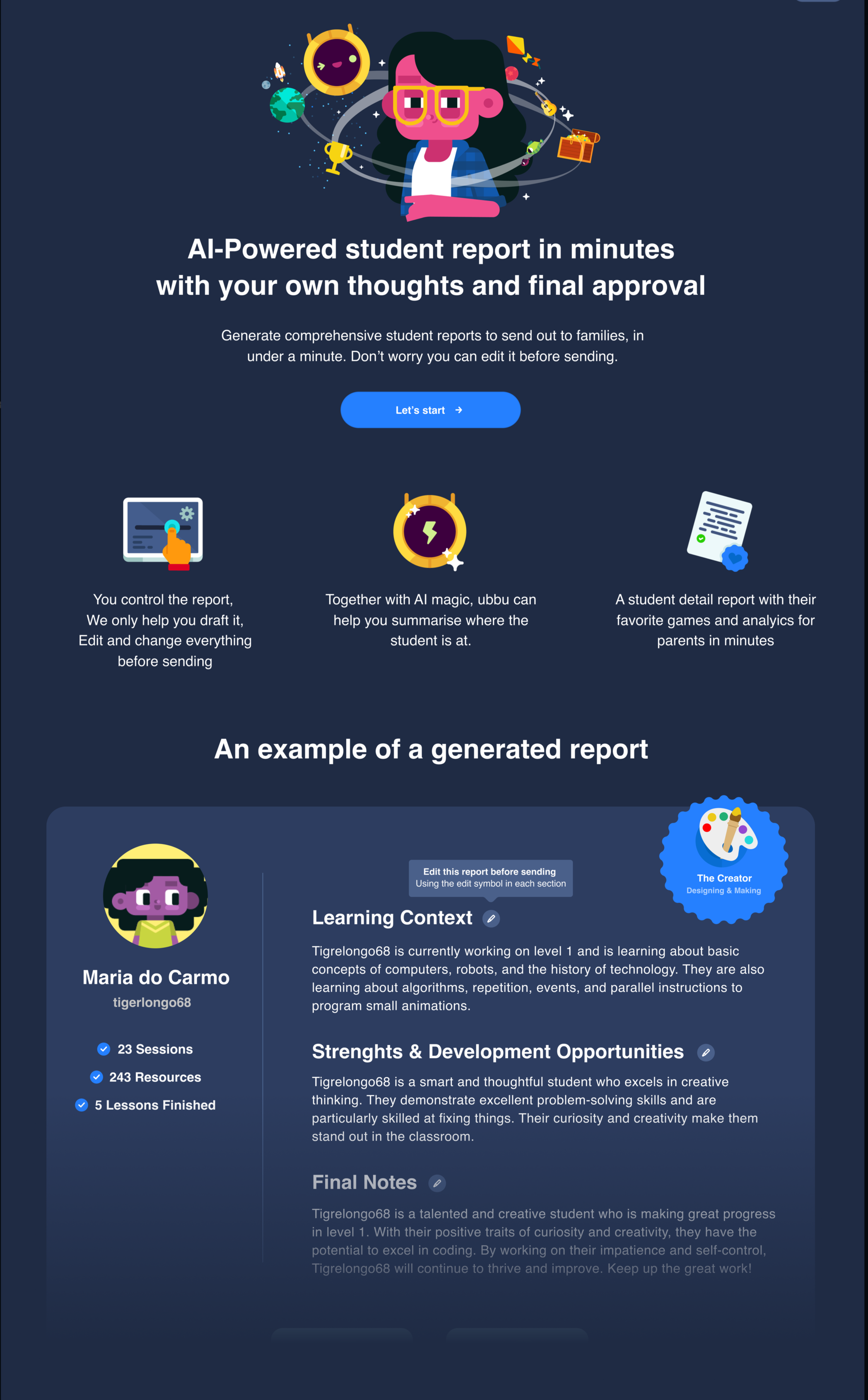 Writing report cards is one of the most time-consuming things a teacher does, and one of the least supported. The data exists: sessions completed, lessons finished, projects created, challenges attempted. But turning that into something a parent actually wants to read? That's still entirely on the teacher. A blank page, a student username, and not enough time.