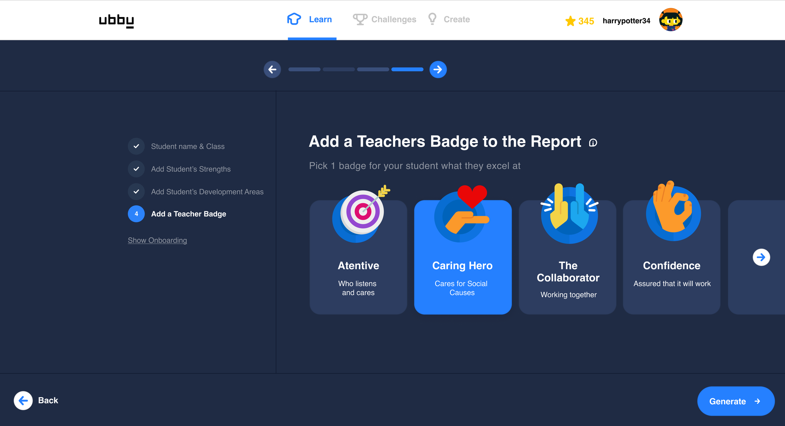 Right before generation, the teacher picks a badge for their student. Caring Hero. The Collaborator. Confidence. One badge, their choice, based on something they know about that child that no data point could tell us.